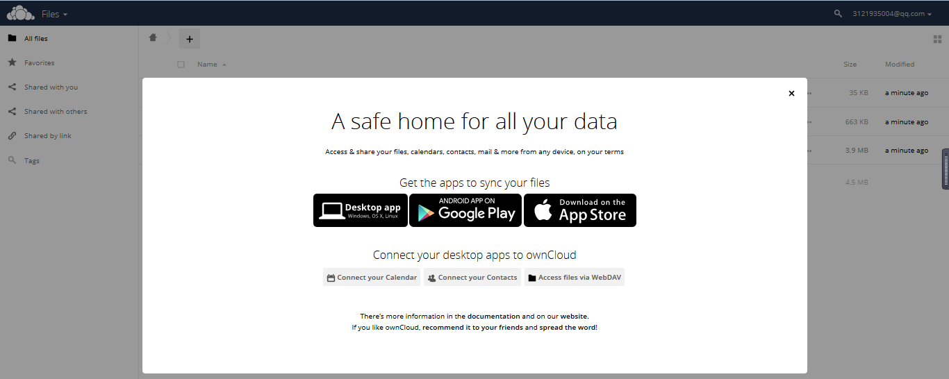 OwnCloud 是一个 文档与实时内容协作平台,它被用于 文档协作/企业网盘 家庭服务器 企业文档与知识共享 等场景。ownCloud用于自建私有网盘的云存储开源软件,功能类似百度云盘,提供了PC、IOS和Android三个同步客户端。