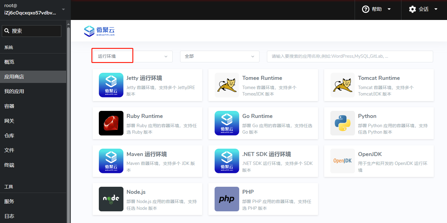登录 Websoft9 控制台,打开:"应用商店" 的 运行环境 类目